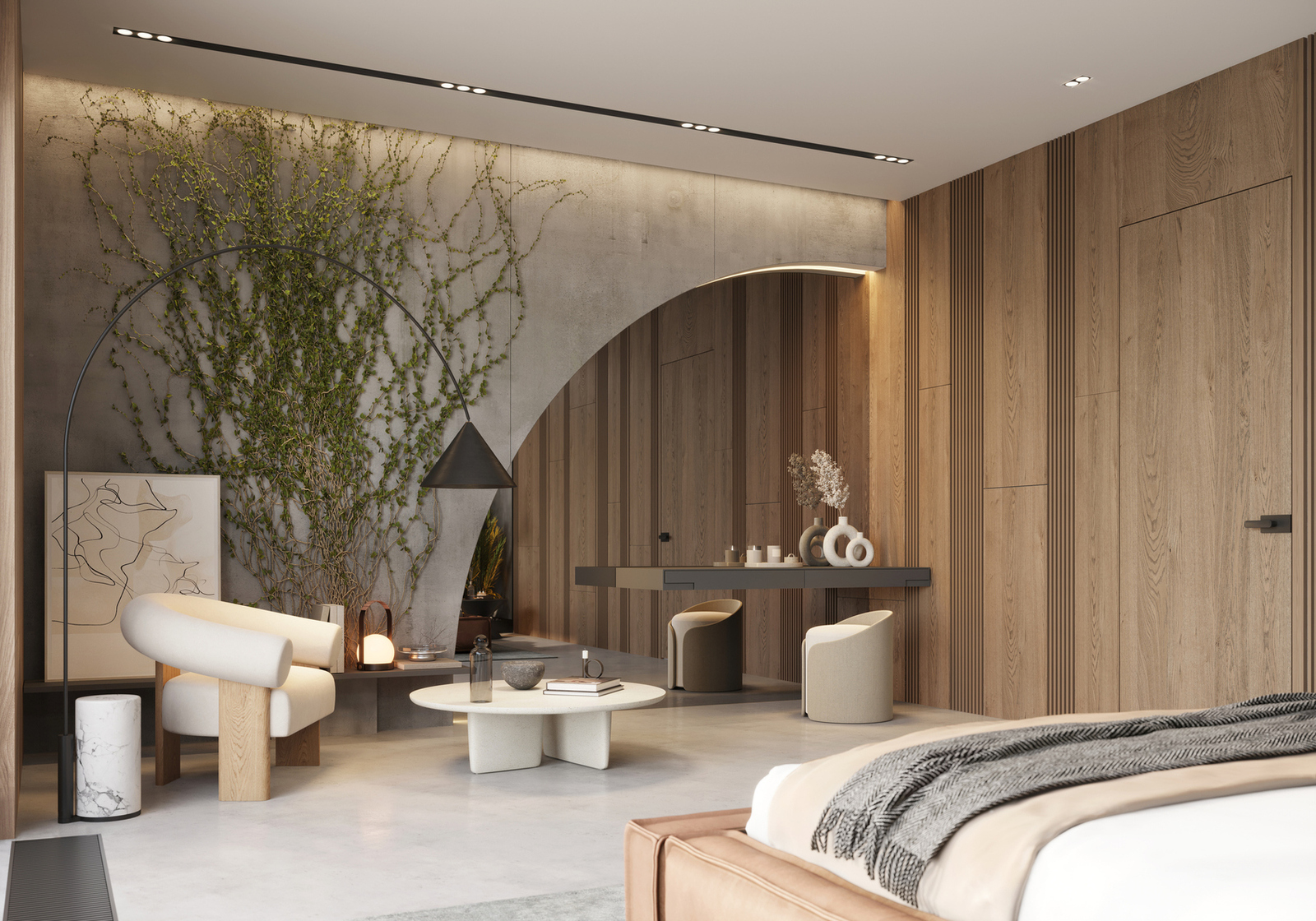The luxurious interior design blends premium materials, elegant furnishings, sophisticated lighting, clean lines, and artistic details, crafting a timeless and refined ambiance that offers a true sanctuary of serenity.